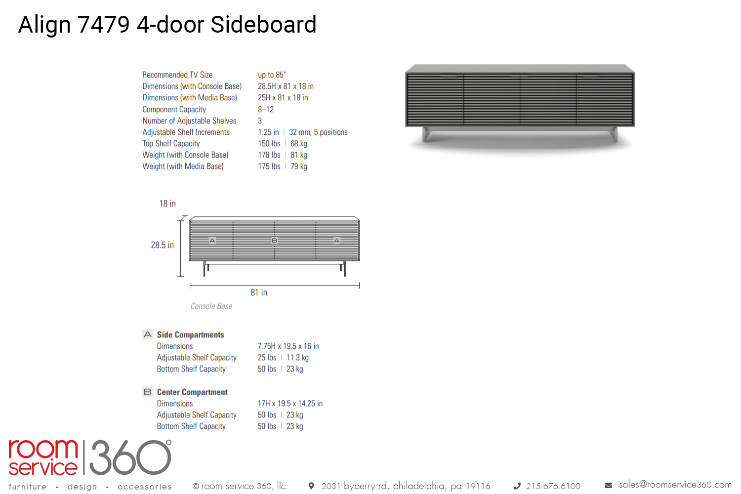 Perfect for areas in need of storage and display capabilities, the Align 7479 4-door sideboard by BDI makes a stylish statement in a modern home. The four louvered doors are eye-catching and have a cool multi-dimensional striped pattern. With adjustable shelves, it accommodates belongings of all sizes and keeps everything organized. The spacious top is the perfect place to display beautiful pieces of decor.