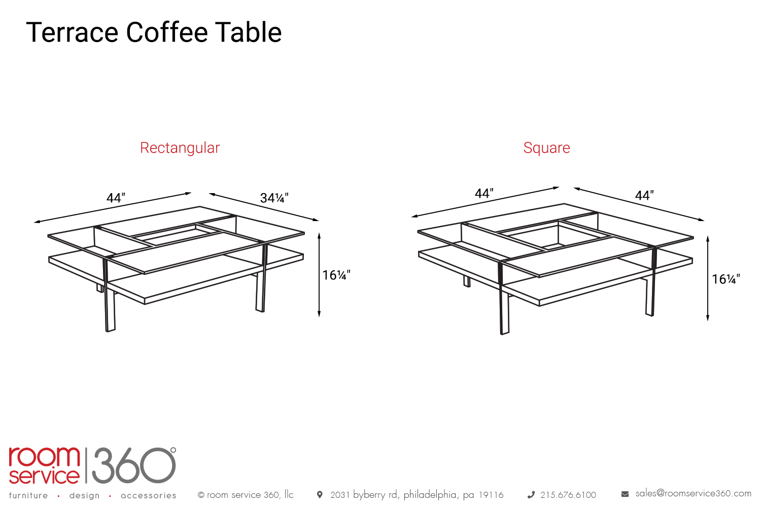 - 44"W × 44"D × 16¼"H