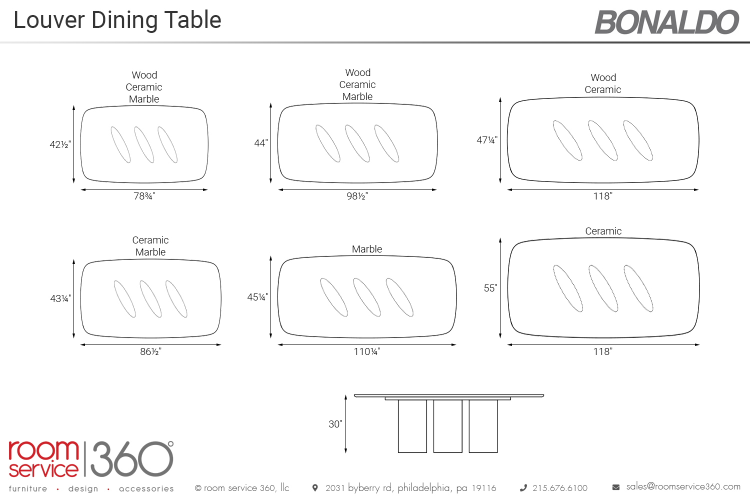 - Marble top: 78¾"W, 86½"W, 98½"W, and 110¼"W