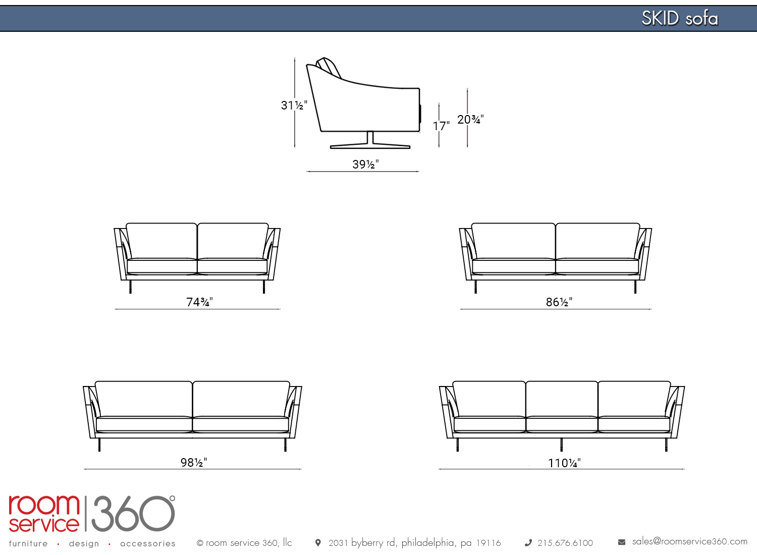 Manufactured in Italy with incredible attention to detail, the Skid sofa is available in four sizes. There's a wide selection of fabric and leather upholstery options, and the base comes in different metal finishes. Choose between a four-legged or sliding base as well.