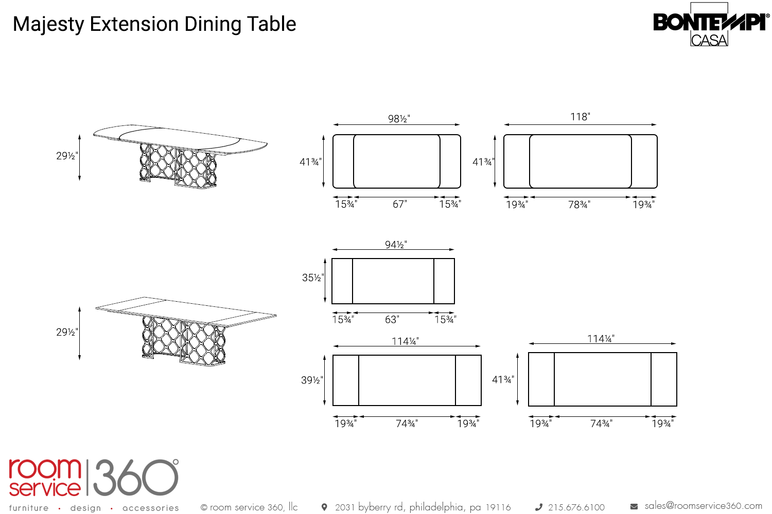 Manufactured in Italy to ensure quality, the Majesty extension dining table is available in rectangular and barrel sizes. The top comes in glass, wood, and ceramic finishes, while the base and decorative details come in metal options.