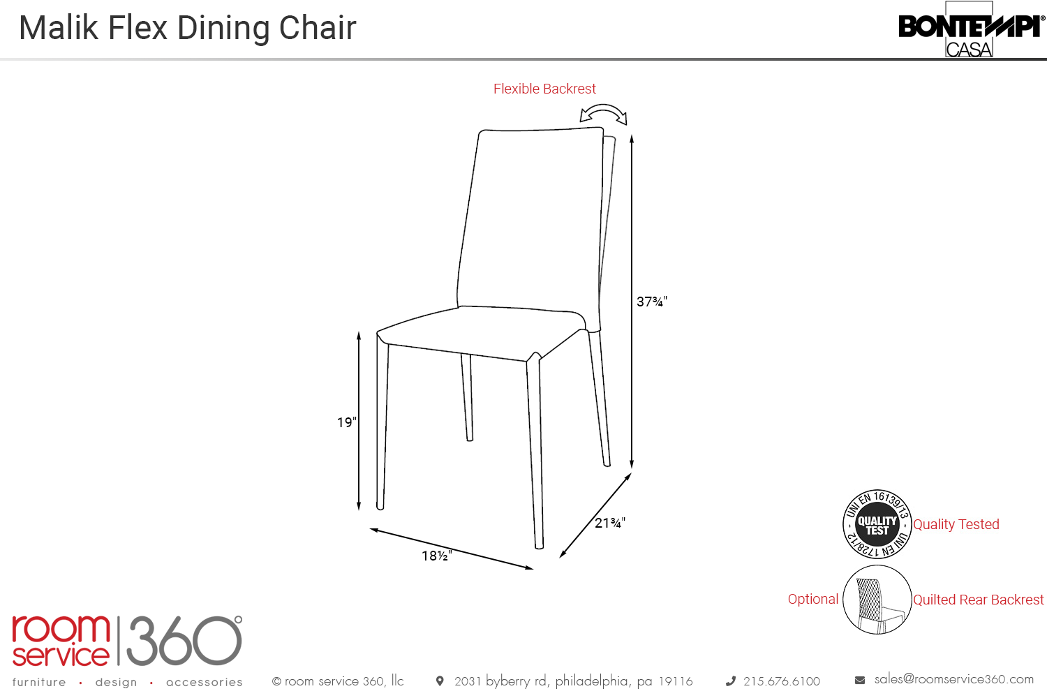 A sensible furnishing for the modern home, the Malik flex dining chair is full of stylish and functional qualities. Upholstery and metal are set in a classic form with a square back, cushioned seat, and four supportive legs for seamless incorporation into various dining room concepts. Select a diamond-quilted rear backrest as opposed to the standard version for a touch of regality. An ergonomic back flexes rearwards to adhere to personalized dining experiences so you can stretch out and relax at a specific angle.