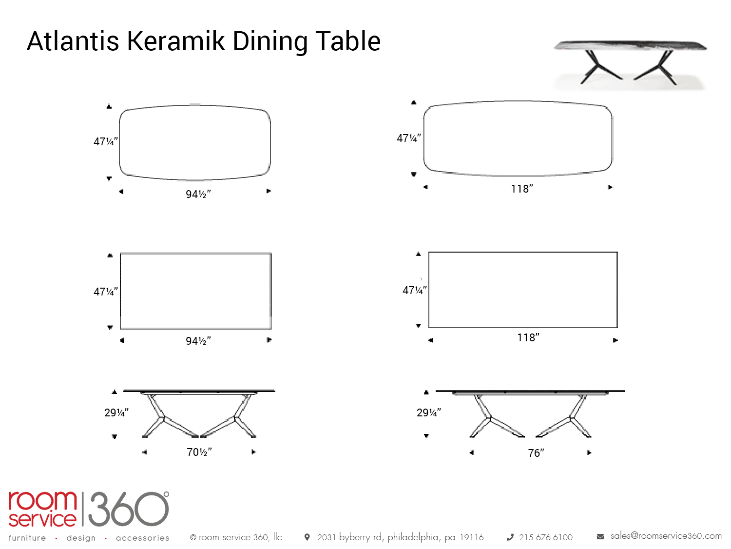 - 118"W × 47¼"D × 29¼"H