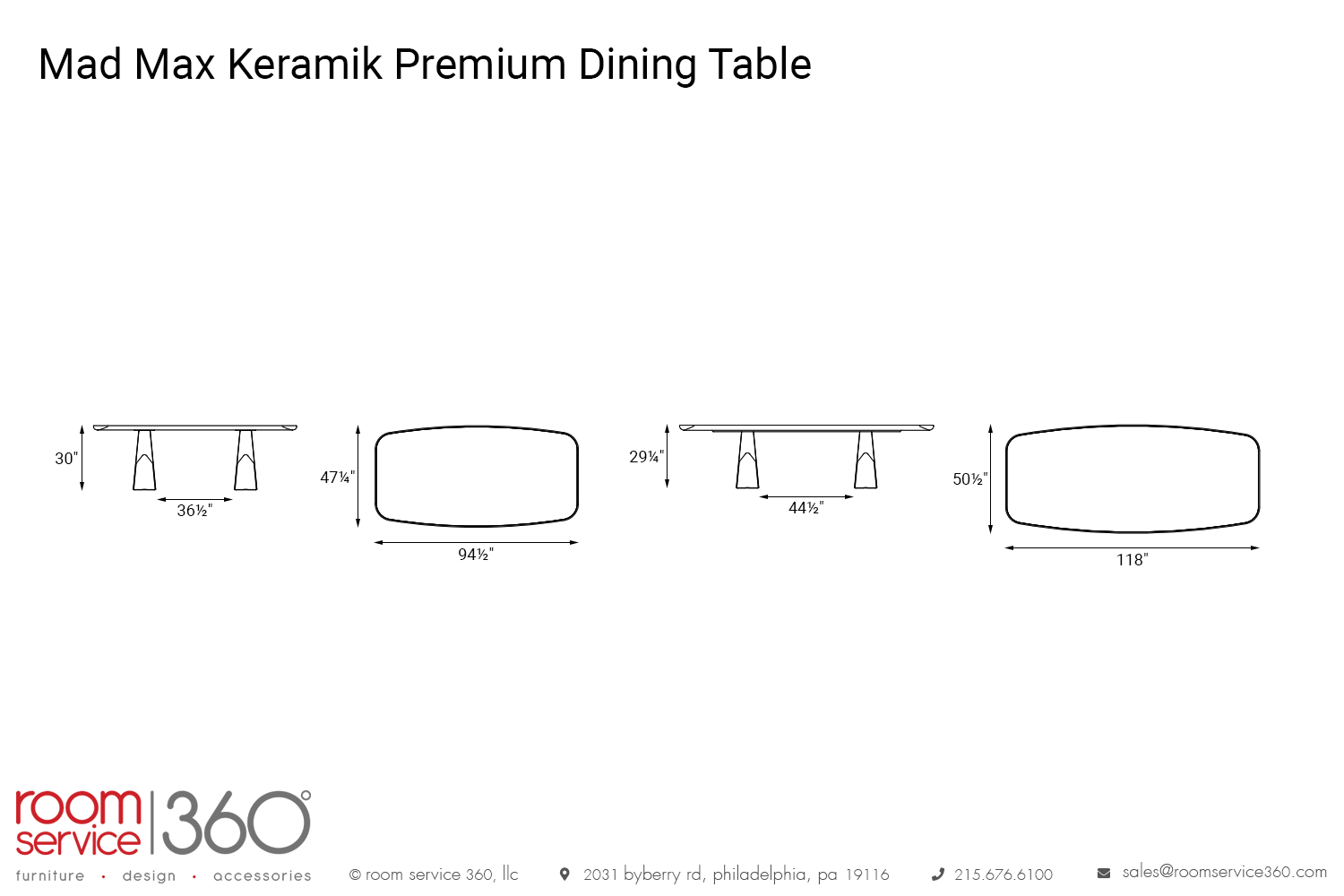 - 118"W × 50½"D × 29¼"H