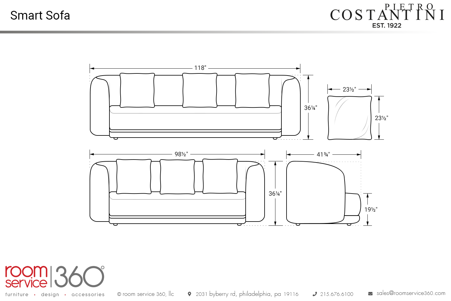 - 118"W × 41¾"D × 36¼"H