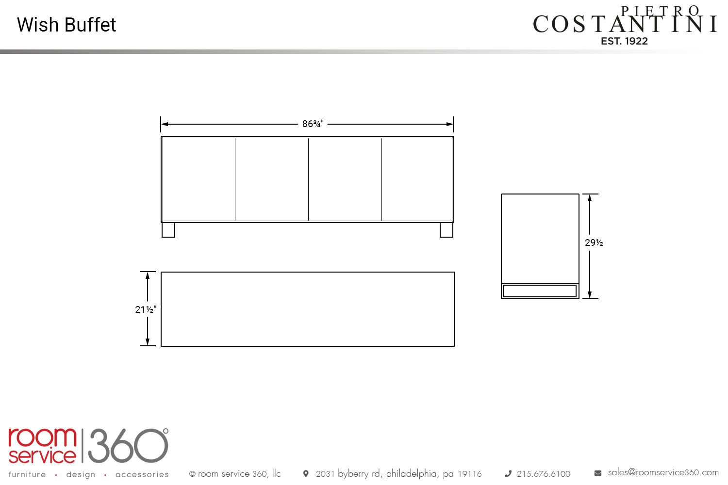 Manufactured in Italy by Costantini Pietro, the Wish buffet is finished in a high gloss lacquer with a variety of color options. The base has various metal finishes for added appeal.