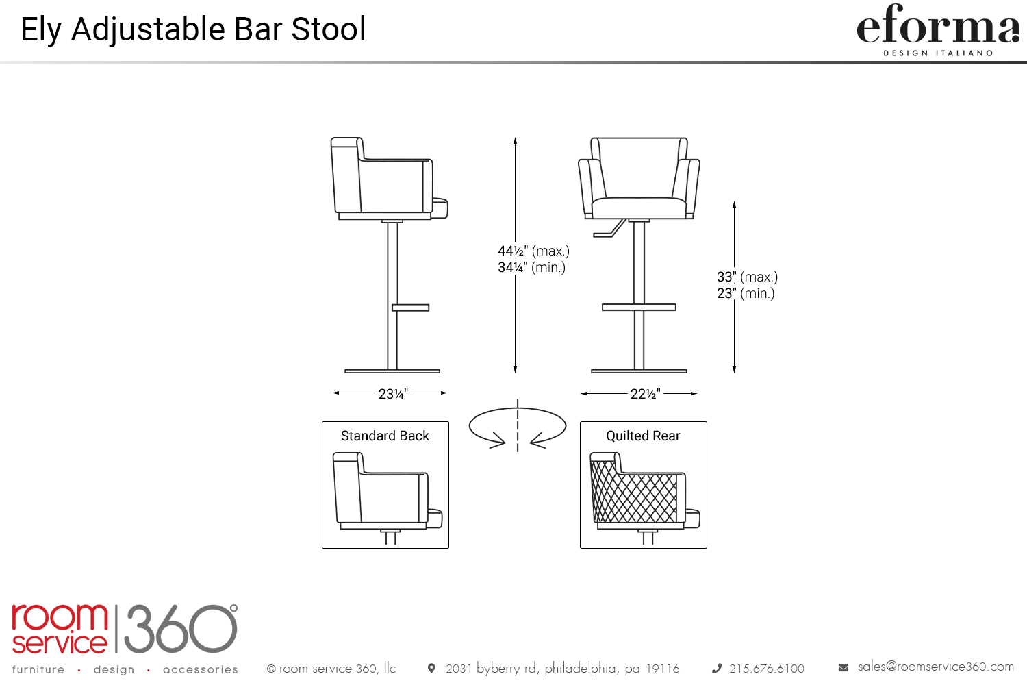 The Ely Adjustable Bar Stool blends timeless elegance with contemporary functionality. Its clean silhouette and luxurious upholstery elevate both residential and professional spaces, from stylish kitchens to sophisticated office lounges. The 360° swivel base and height-adjustable seat offer dynamic comfort that adapts to any environment. The option of a diamond-quilted backrest presents even more opportunities to embellish a room composition. The Ely Stool is a luxurious complement piece that harmoniously balances with modern décor, making it a refined choice for any interior.