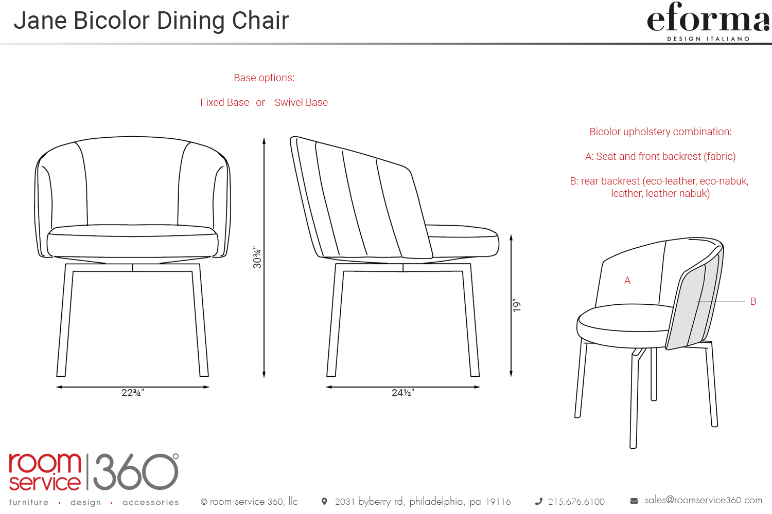 Customize your experience by choosing from various fabric, leather, and eco-leather upholstery options, as well as different metal finishes for the base. Part of the Jane collection designed by Antoy Filips, the Jane bicolor dining chair is meticulously manufactured by Eforma in Italy.
