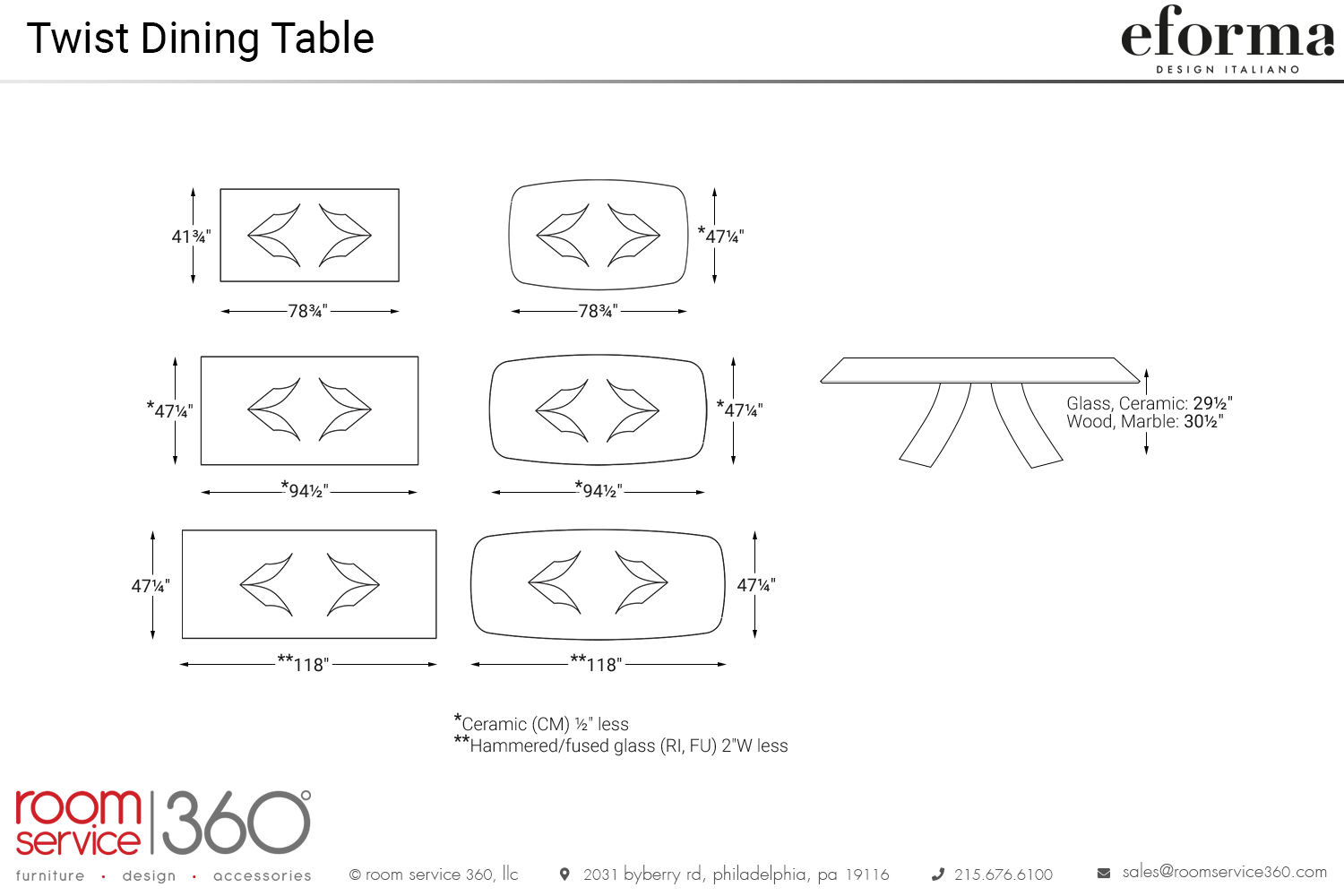 - 118"W × 47¼"D (hammered/fused glass 2"W less)