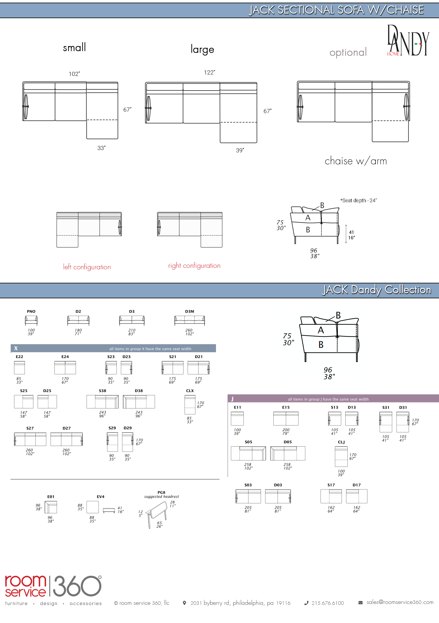 The Jack sectional sofa with chaise is available in 2 sizes with a left or right configuration. With a sturdy metal frame and hardwood seat base, Jack’s seat and back cushions are filled with polyurethane foam covered in goose feathers for ultimate comfort. The chaise section can have an arm on special request. A wide selection of genuine Italian leathers and fabrics are available that are complemented by sleek metal legs.