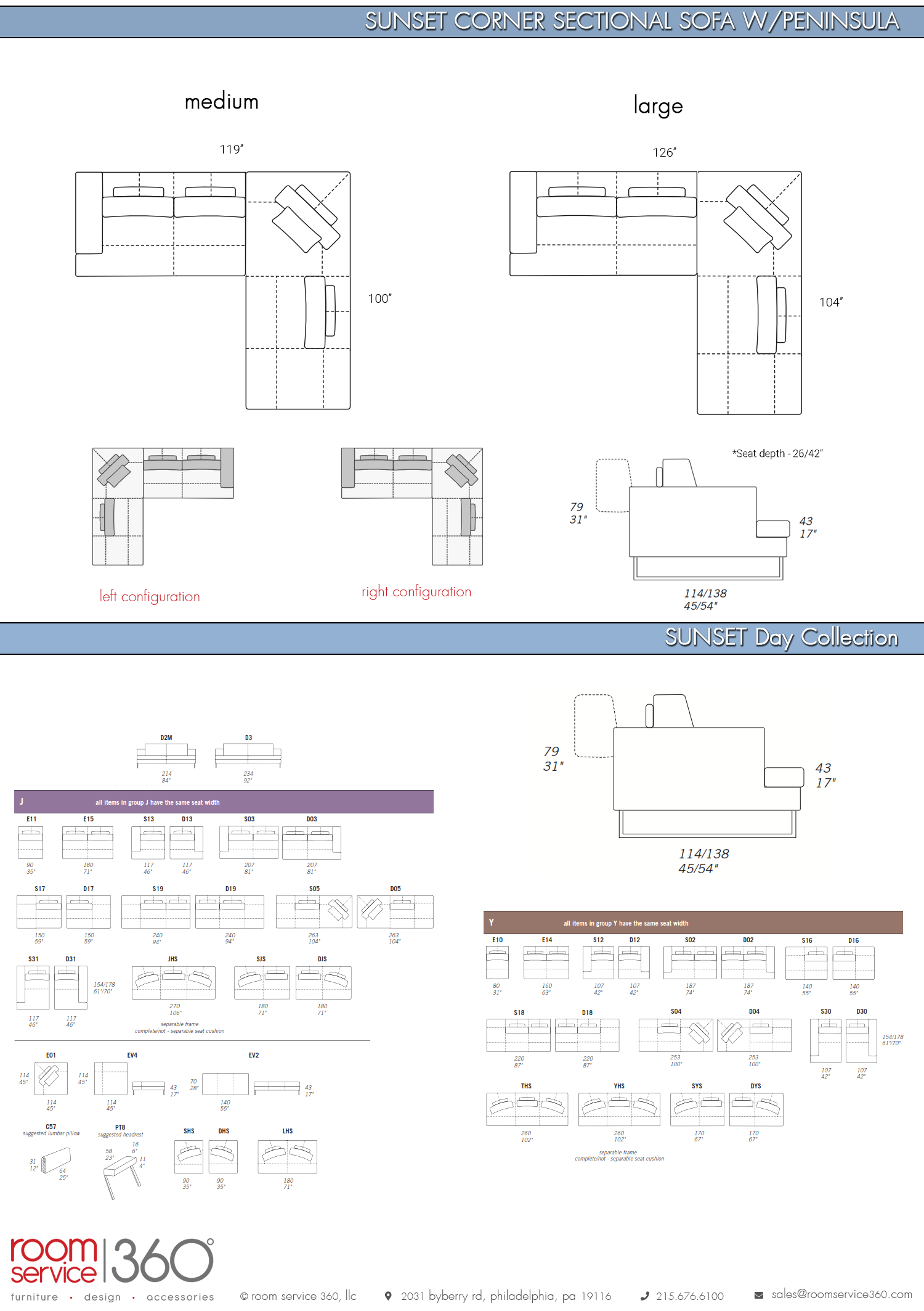 Sunset corner sectional with peninsula is available in two sizes with left or right configurations. It features a hardwood frame, feather filled seats and backs, metal legs, and wide armrests. It can be upholstered in any of the available leather or fabric options.