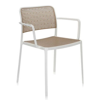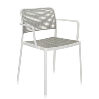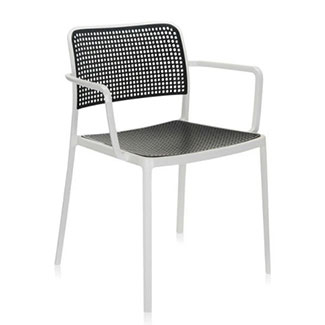 The Audrey dining chair by Kartell is a stylish, durable seating solution that is suitable for both indoor and outdoor use. The geometrically inspired pattern has circular cutouts that create a cool checkered pattern. With an opening between the top and seat, it has a lightweight and airy personality. Thanks to the slightly curved back, it provides comfort and support for years to come.