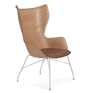 The K/wood leather lounge chair by Kartell is an ideal place to sit back and relax and looks lovely in a contemporary setting. The luxurious leather and shell-like silhouette molds to your body for a comfortable element, while the sturdy angled legs and slightly curved back offer support and durability. With various shapes and finishes, it creates a vibrant juxtaposition for a bold and stylish touch. A matching ottoman is part of the collection to form a cohesive finishing look.
