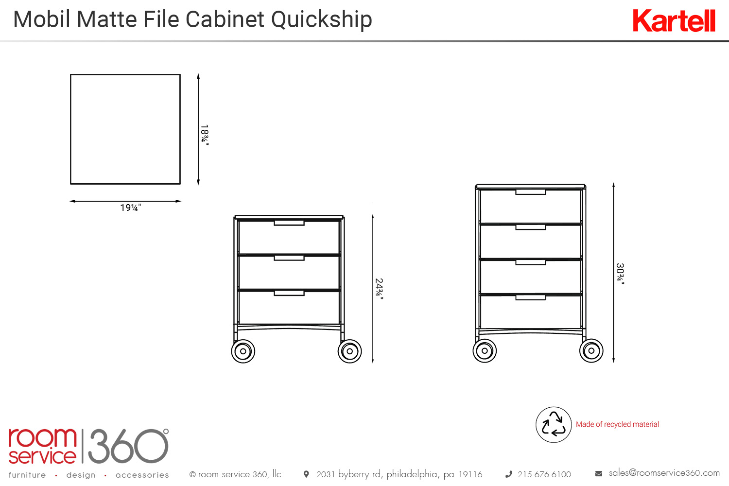 This cabinet is available in matte black, white, and pale green. The frame is steel, painted in the same color as the drawers. The Mobil Mobile File Cabinet Quickship is designed by Antonio Citterio with Oliver Löw for Kartell and is part of the Mobil collection. Since it is a quickship item, it can arrive to you in a convenient 2-4 weeks.