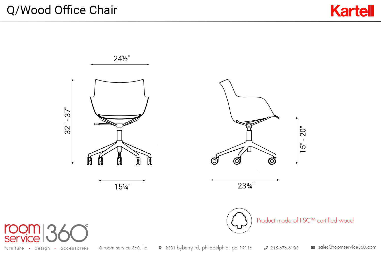 Be comfortable as you work with the sleek Q/Wood office chair by Kartell. The practical design features an ergonomic wooden seat with an upholstered seat cushion, a height-adjustable swiveling base, and smooth-moving castors. Because of the slightly angled back and sloped armrests, this chair offers support to promote proper posture when working. This chair pairs perfectly with the Earl of Wood office desk, making this duo a must-have for your home office.