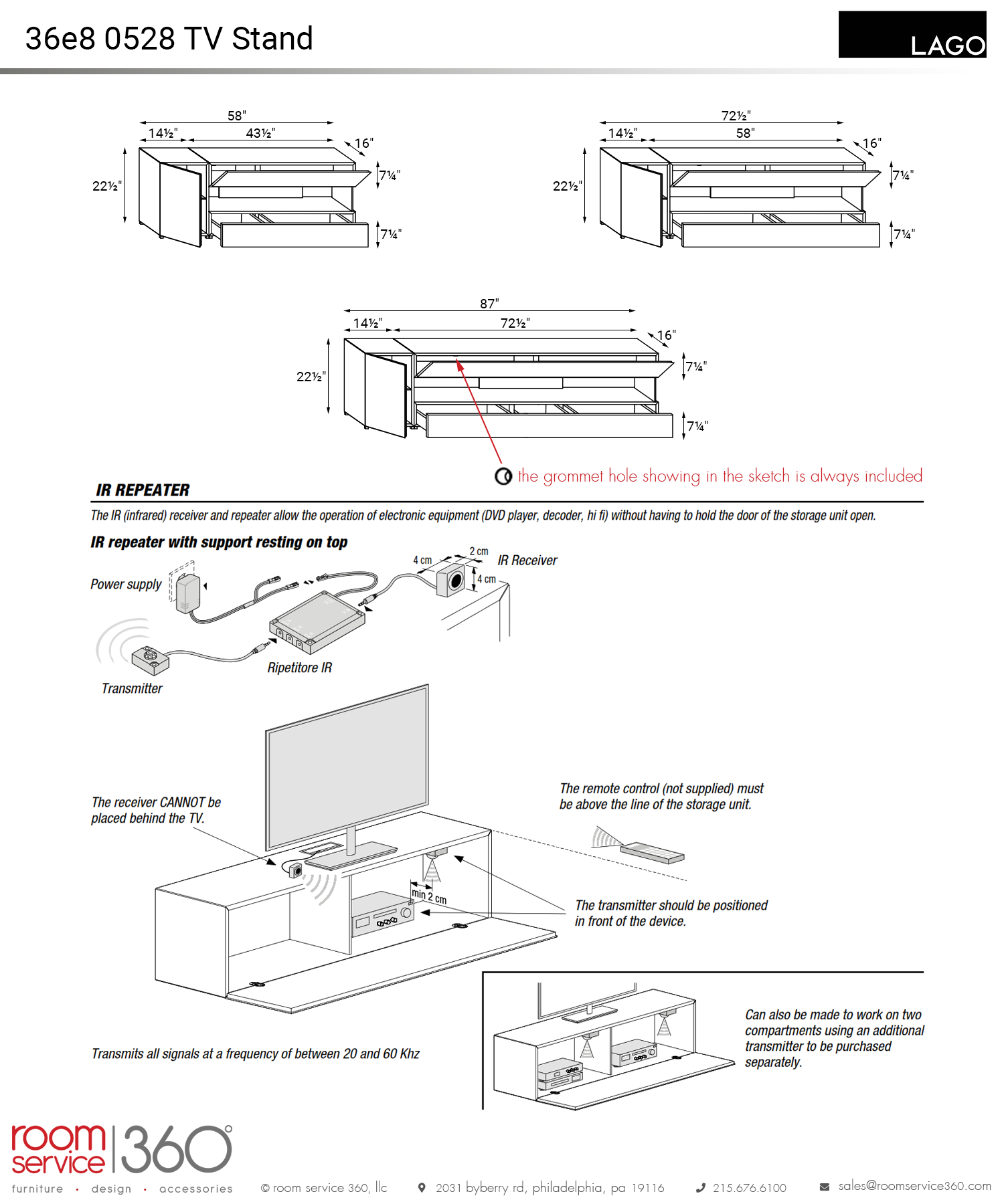 Manufactured in Italy with incredible attention to detail and designed by Daniele Lago, the 36e8 0528 TV stand is available in three sizes with an optional cable duct. The frame comes in matte lacquer finishes, while the front comes in those finishes and glass options. The optional IR-repeater comes with one or two transmitters.