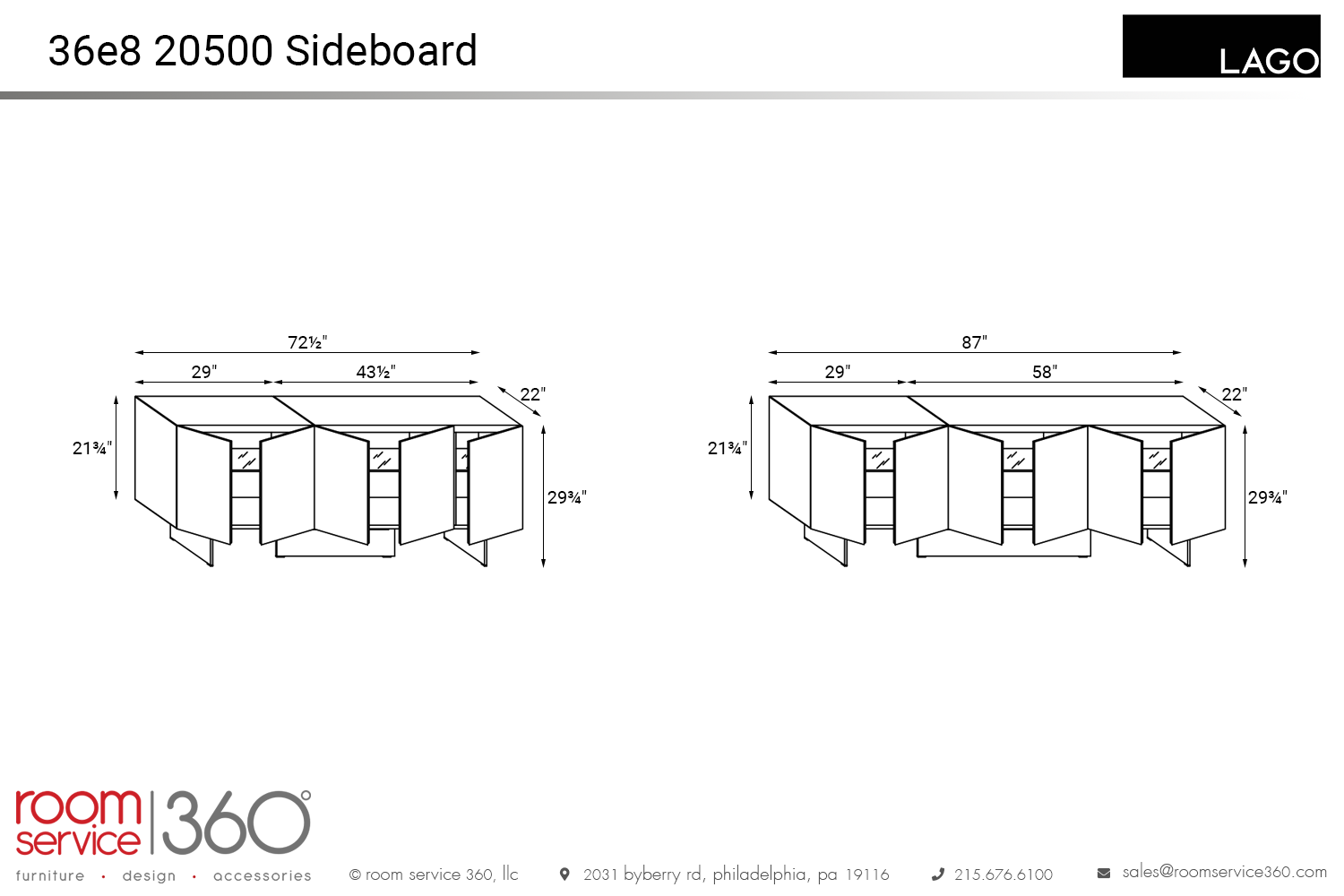 The 36e8 20500 sideboard by Lago is a sleek, sophisticated addition to a modern home. With multiple swing-door compartments, it keeps items organized and out-of-sight for a convenient element. The minimal silhouette fits in well with the rest of the room's furniture and decor but still makes a grand impression on its own. Contrasting finishes stand out against one another and creates a vibrant juxtaposition for a complementary touch. By using only quality materials, this sideboard will be a staple piece of furniture.
