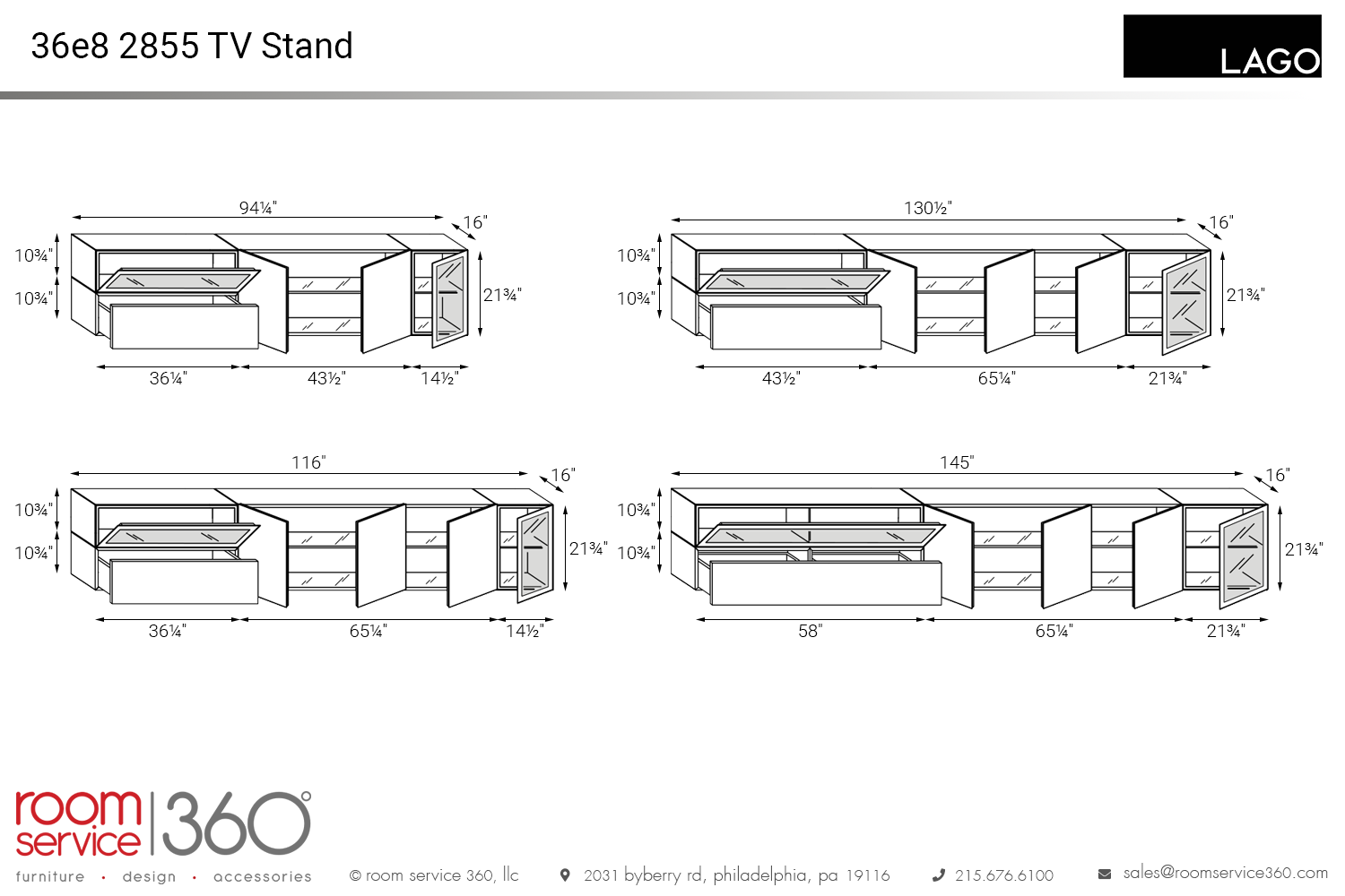 - 145"W × 16"D × 21¾"H