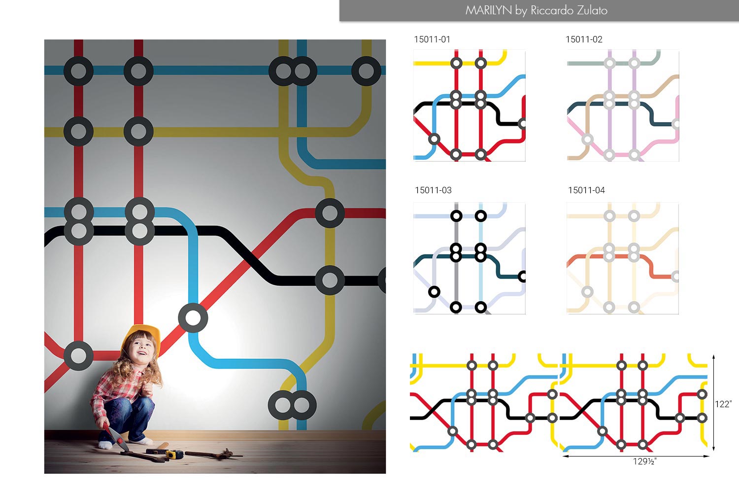 The Merilyn 15011 wallpaper offers a modern chic, yet quirky backdrop for any room in the house. Designed by Riccardo Zulato and manufactured in Italy for LondonArt Wallpaper, this wallpaper calls to mind the twists and turns of public transportation maps, with brightly colored curving lines shifting over and under each other and meeting up at unfilled bubbles. The shapes created by these lines invite you to ponder where these lines may be going or what they mean, making for an engaging and interesting design.