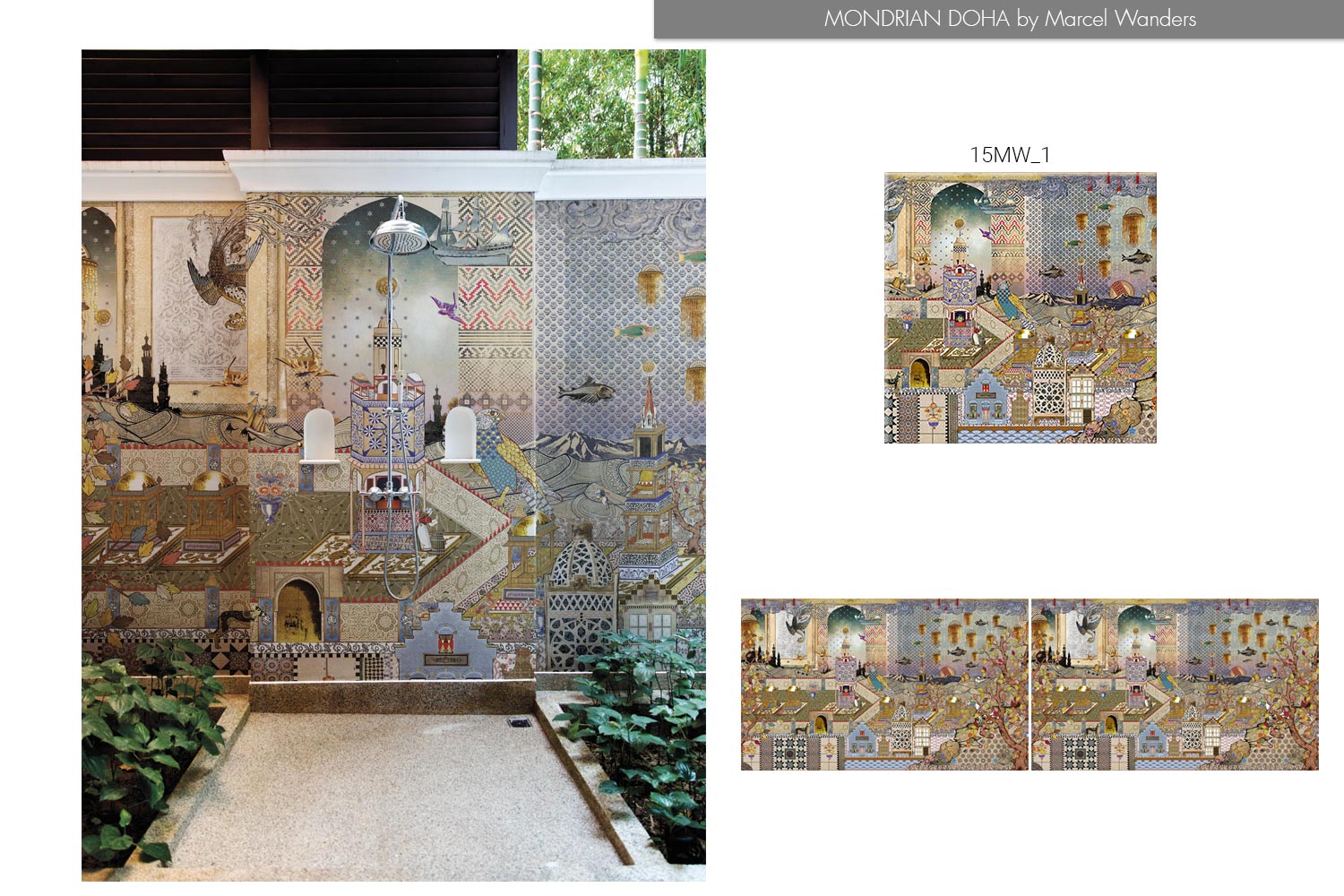 Inspired by “One Thousand and One Nights”, the famed collection of tales from the Middle East, the Mondrian Doha 15MW wallpaper and its eclectic design enriches a contemporary space with stunning cultural motifs. A blend of Arabic elements like painted miniatures, Arabic script, and souks - or marketplaces - and their inherently beautiful patterns and colors take part in this wallpaper's makeup, along with attractive flora and fauna. Also interspersed throughout the wallpaper are Dutch ideas, reinforcing that this is a Marcel Wanders design.