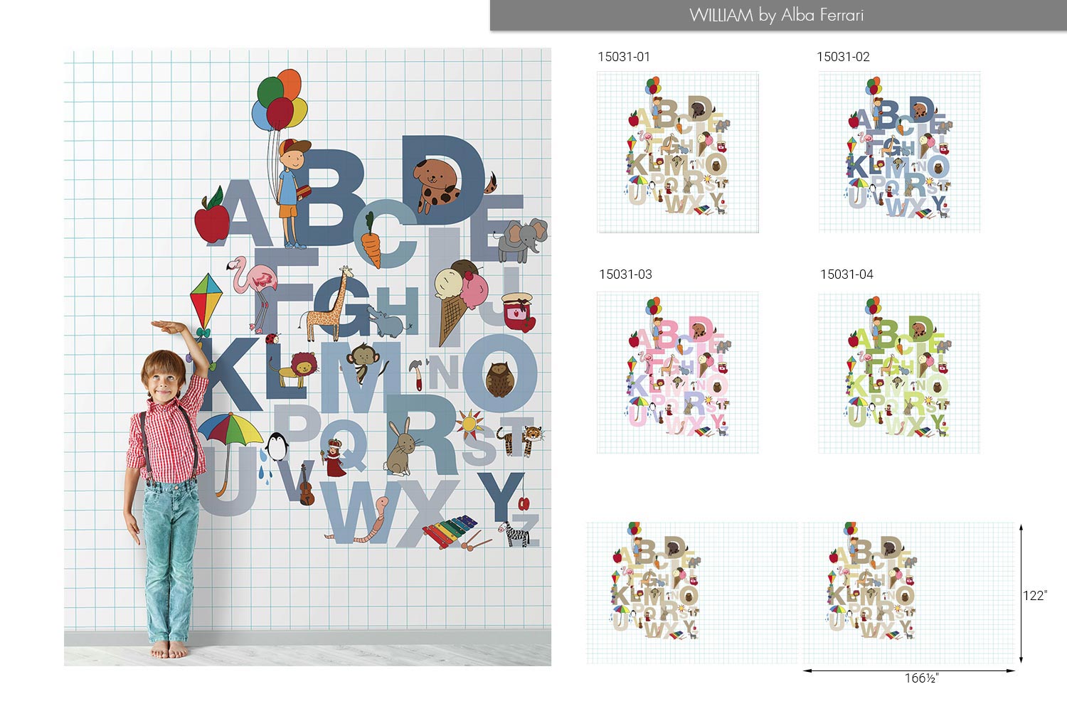Give your child’s bedroom walls a modern, yet playfully chic pop of color with LondonArt’s William 15031 designer wallpaper by Alba Ferrari. Designed and manufactured in Italy, this wallpaper features a nostalgic graph paper background with the letters of the English alphabet in rows. Items and concepts that begin with each letter interact with each other and peek out from around and behind the alphabet in an adorably fun tableau.