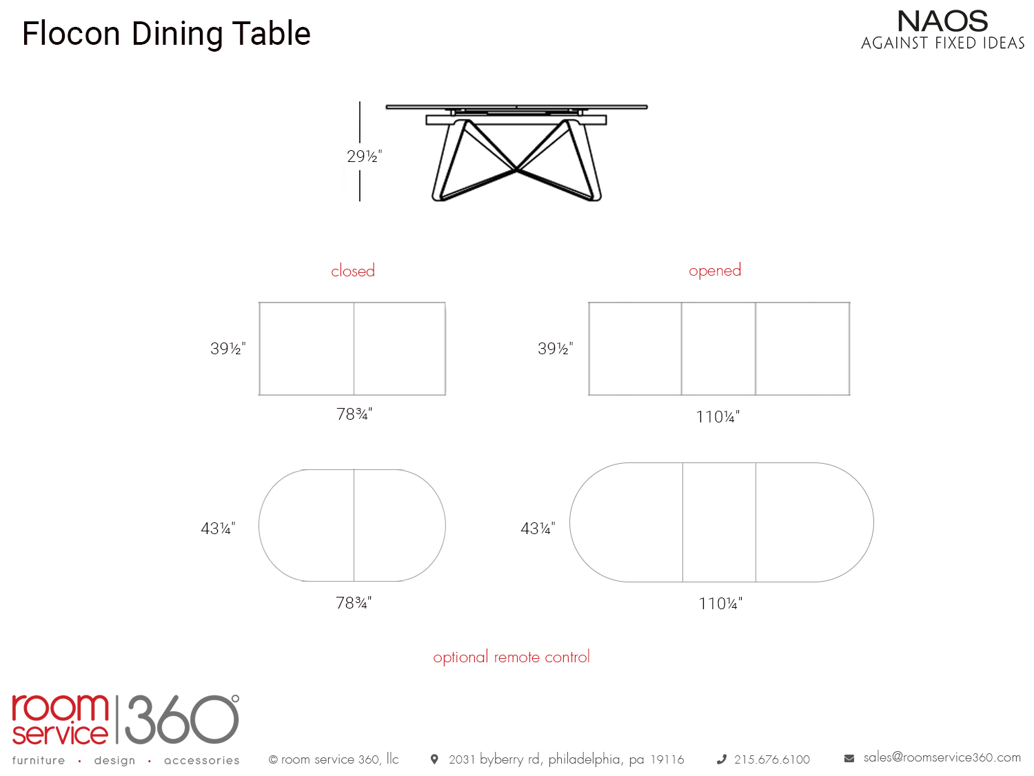 The Flocon dining table is more than just a place to eat--it's a statement piece for any contemporary home. The synchronized mechanism extends the table to accommodate everyone comfortably and it is available with or without a remote control for a convenient detail. Either press a button on the remote or pull the easy-to-use lever to open or close the extension in seconds. The geometrically inspired gears in the extension are a one-of-a-kind feature. The curved lines on the legs are eye-catching and make the table an extraordinary focal point.