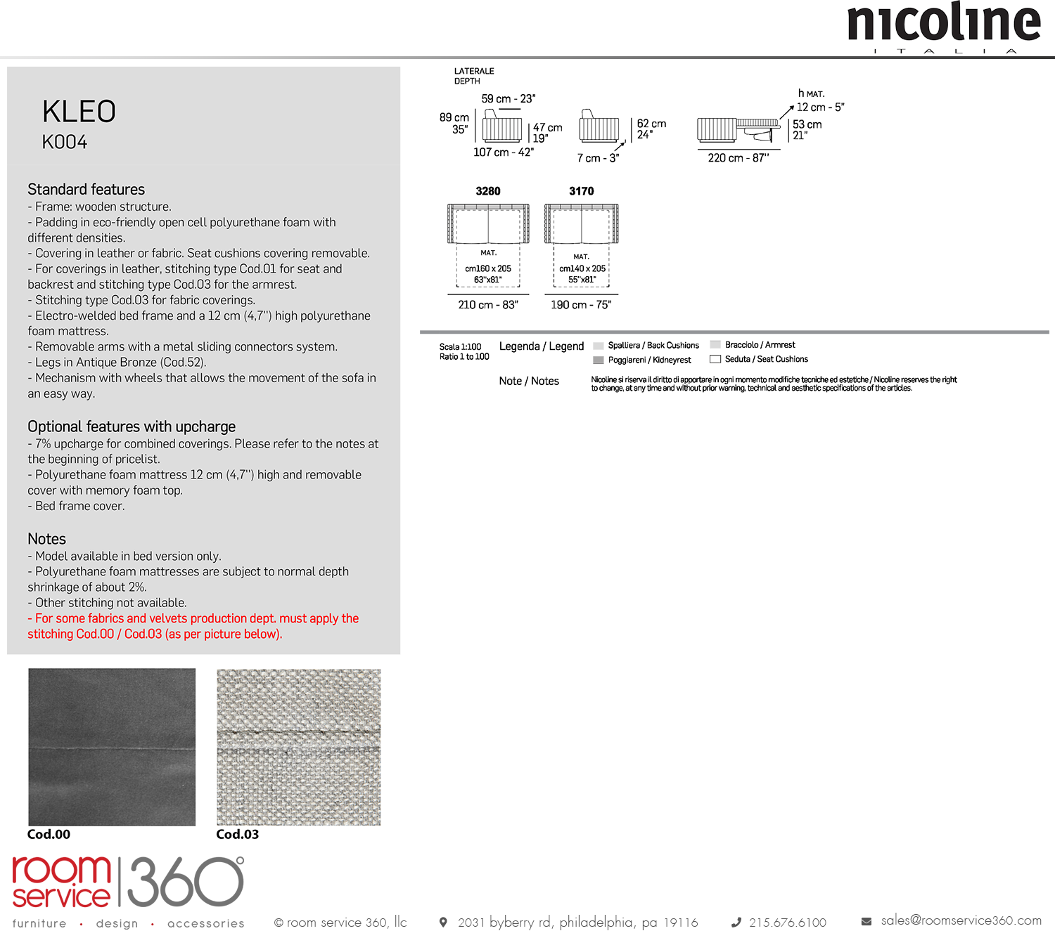 - Upholstery in leather has stitching Cod.01 for seat and backrest and stitching Cod.03 for the armrest