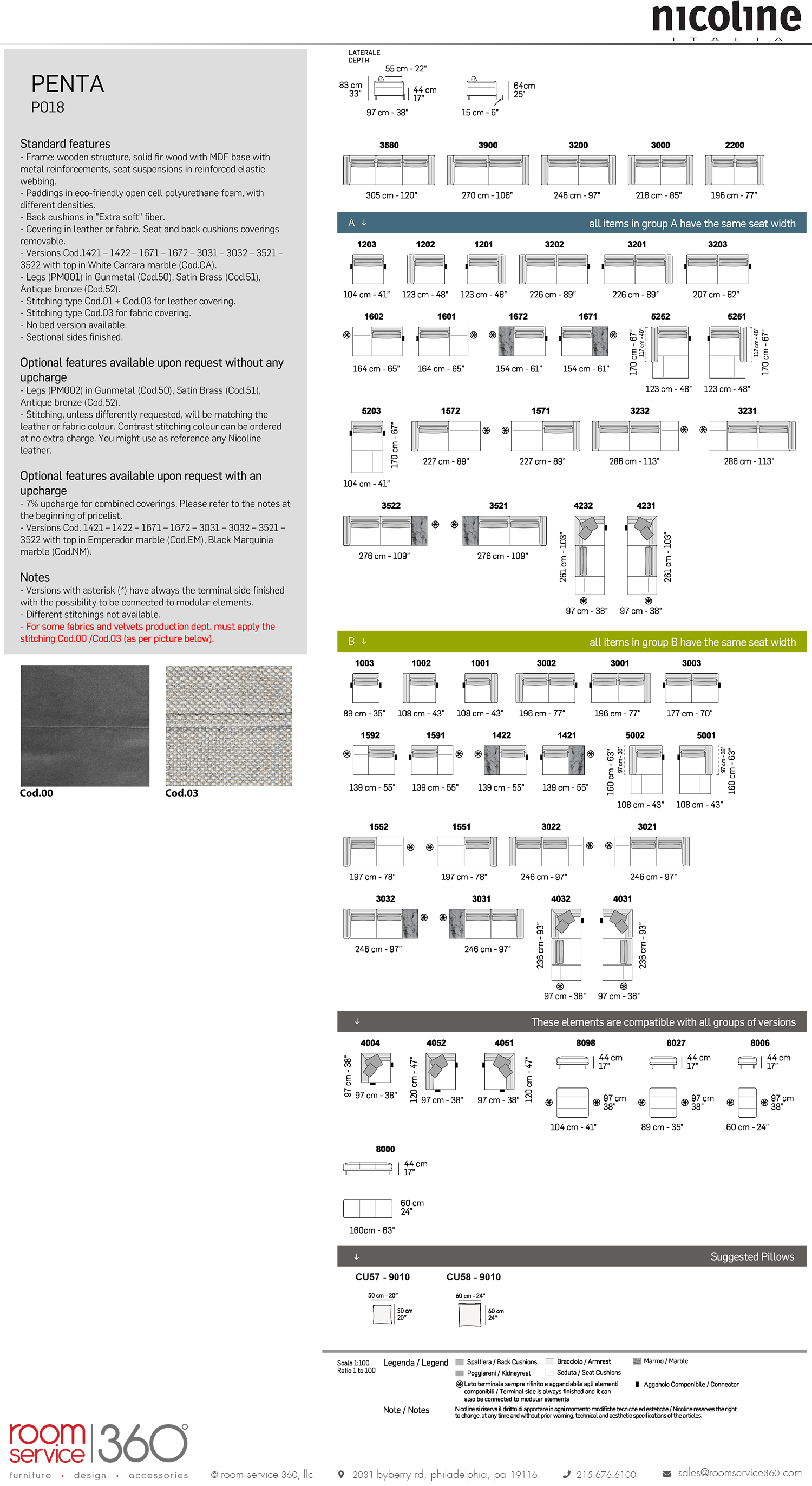 Two sizes and left and right configurations are available to fit your space best. Upholstery options include various fabrics and leathers in many colors, and leg finishes feature three metal options. The stitching can match or contrast light or darker to the sectional. The Penta corner sectional sofa is manufactured in Italy by Nicoline Italia with incredible attention to detail and is part of the Penta collection of seating solutions.