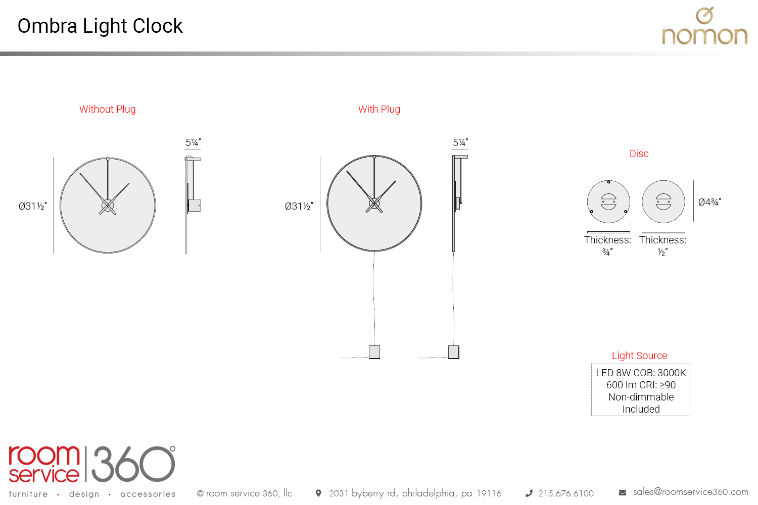- Clock: Ø31½" × 5¼"D
