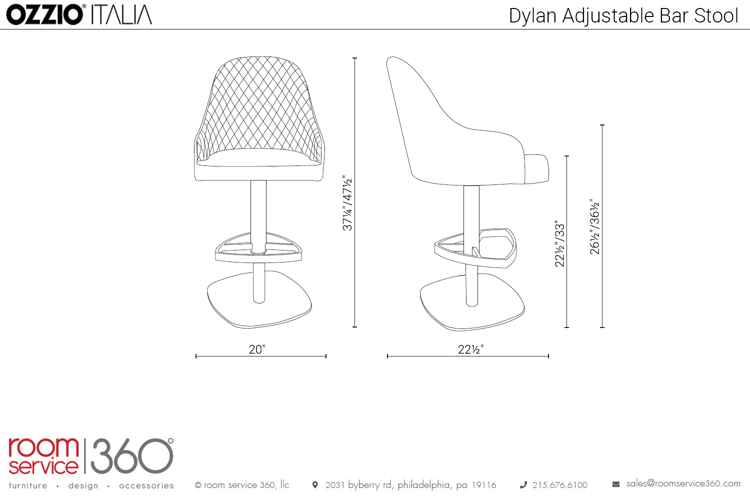 Manufactured in Italy to ensure quality and designed by Studio Ozeta, the Dylan adjustable bar stool is easily customized. Upholstery options include an array of fabrics, leathers, and eco-leathers, while the base comes in metal finishes.