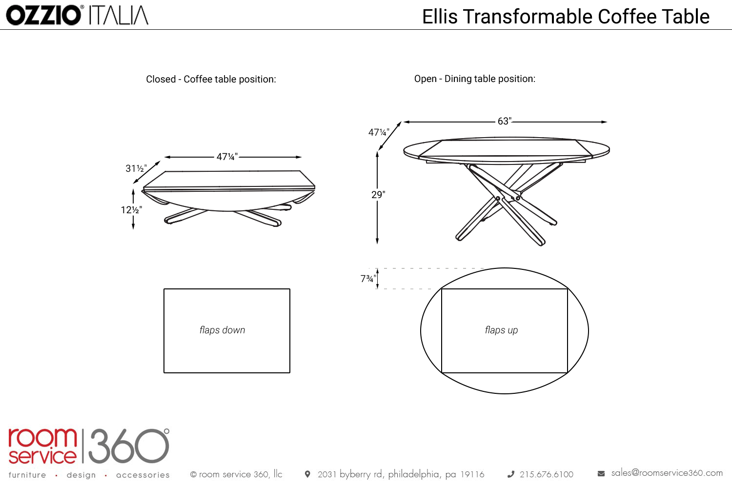 - 47¼"W × 31½"D (all flaps down)
