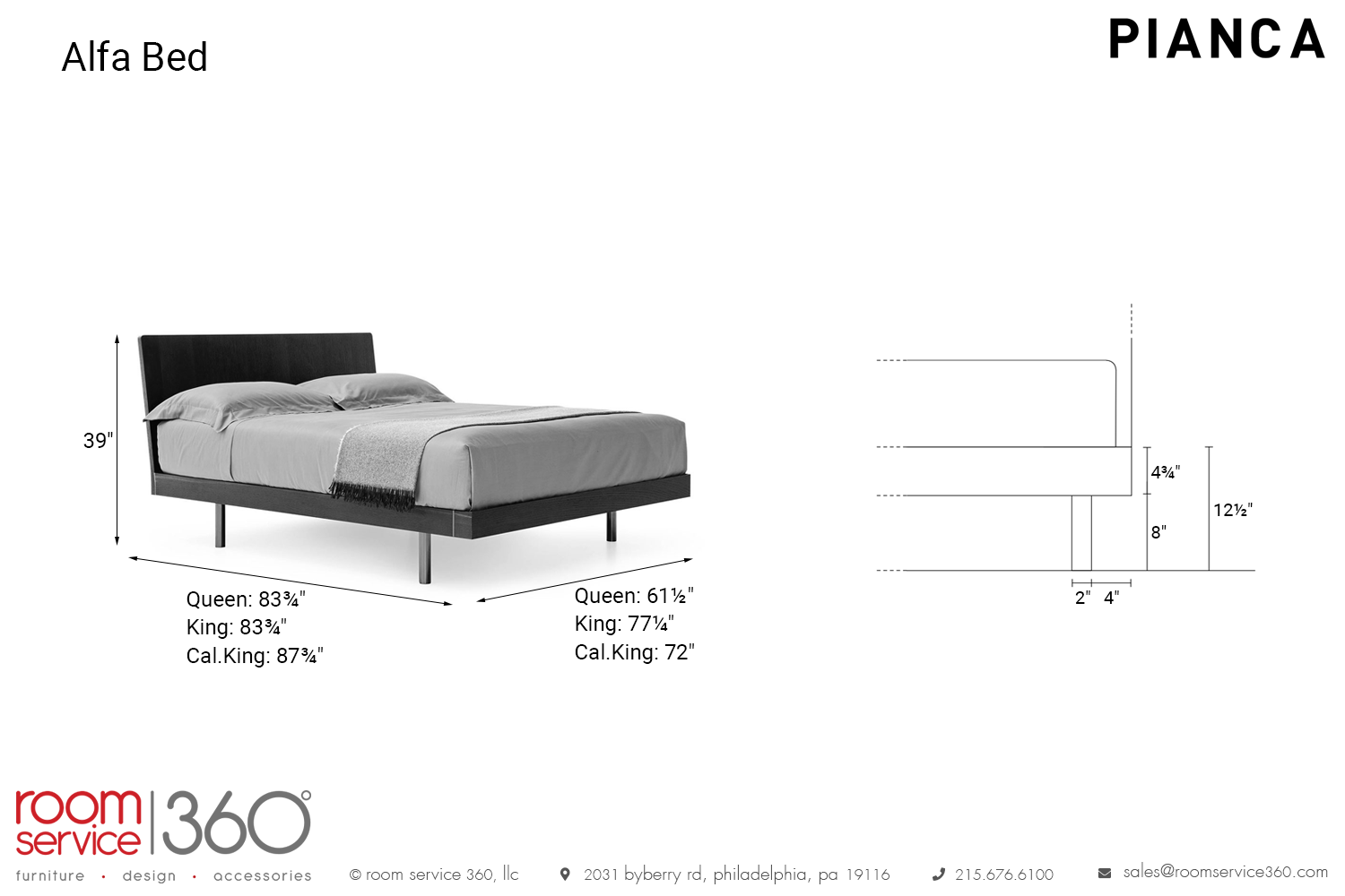 Manufactured in Italy to ensure quality, the Alfa bed is available in queen, king, and California king sizes. The frame comes in laminate, matte lacquer, and wood options, the insert comes in matte lacquer and metal options, and the legs come in matte lacquer, wood, and metal finishes.