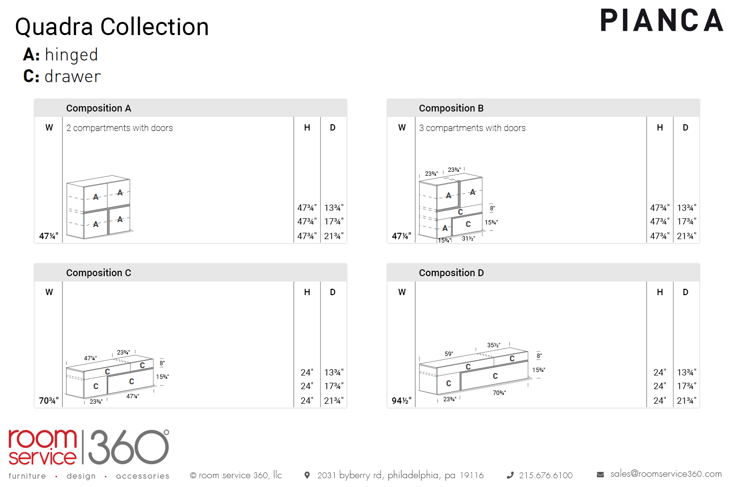 “The combination of beauty and function” is Pianca’s motto, and this is evident in the extensive line of contemporary furnishings. The room service 360° collection from Pianca includes everything needed to furnish homes decorated in the modern interior design style, including a broad array of sofas, beds, tables, chairs, sideboards, wall units, and mirrors. Purchasing a piece of Pianca Italian furniture is an investment in uncompromised elegance, refinement, and style.