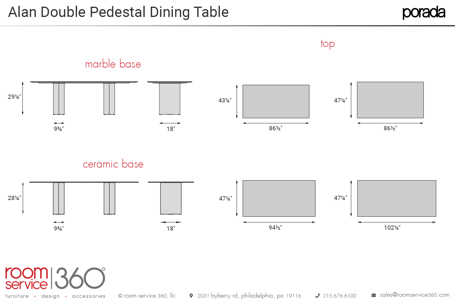 Manufactured in Italy to ensure quality, the Alan double pedestal dining table is available in rectangular and barrel sizes to accommodate individual needs. The top comes in marble and ceramic options, while the base comes in wood and closed-pore matte lacquer finishes. Also, the feet come in different metal colors.