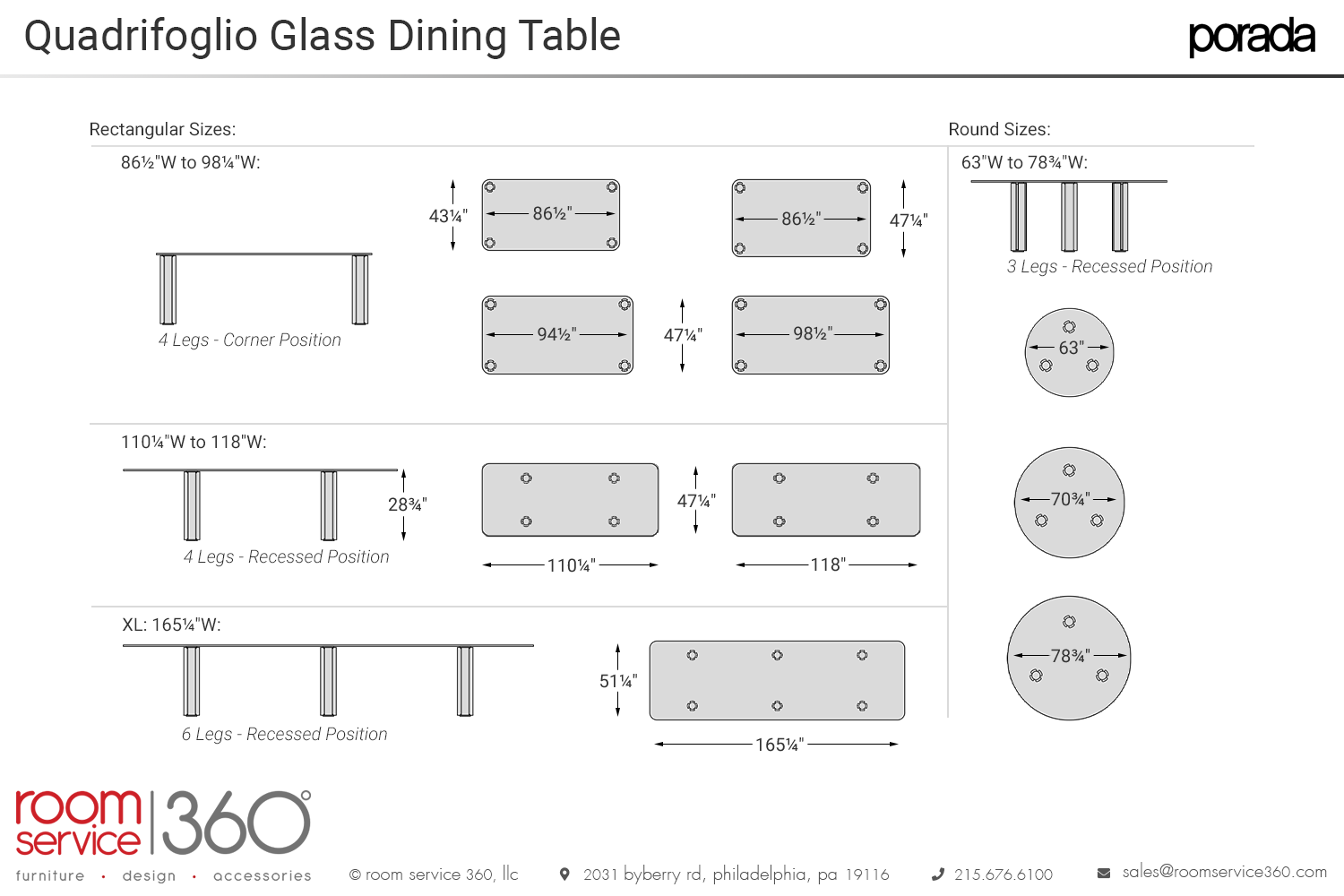 - 165¼"W x 51¼"D (XL: 6 legs)