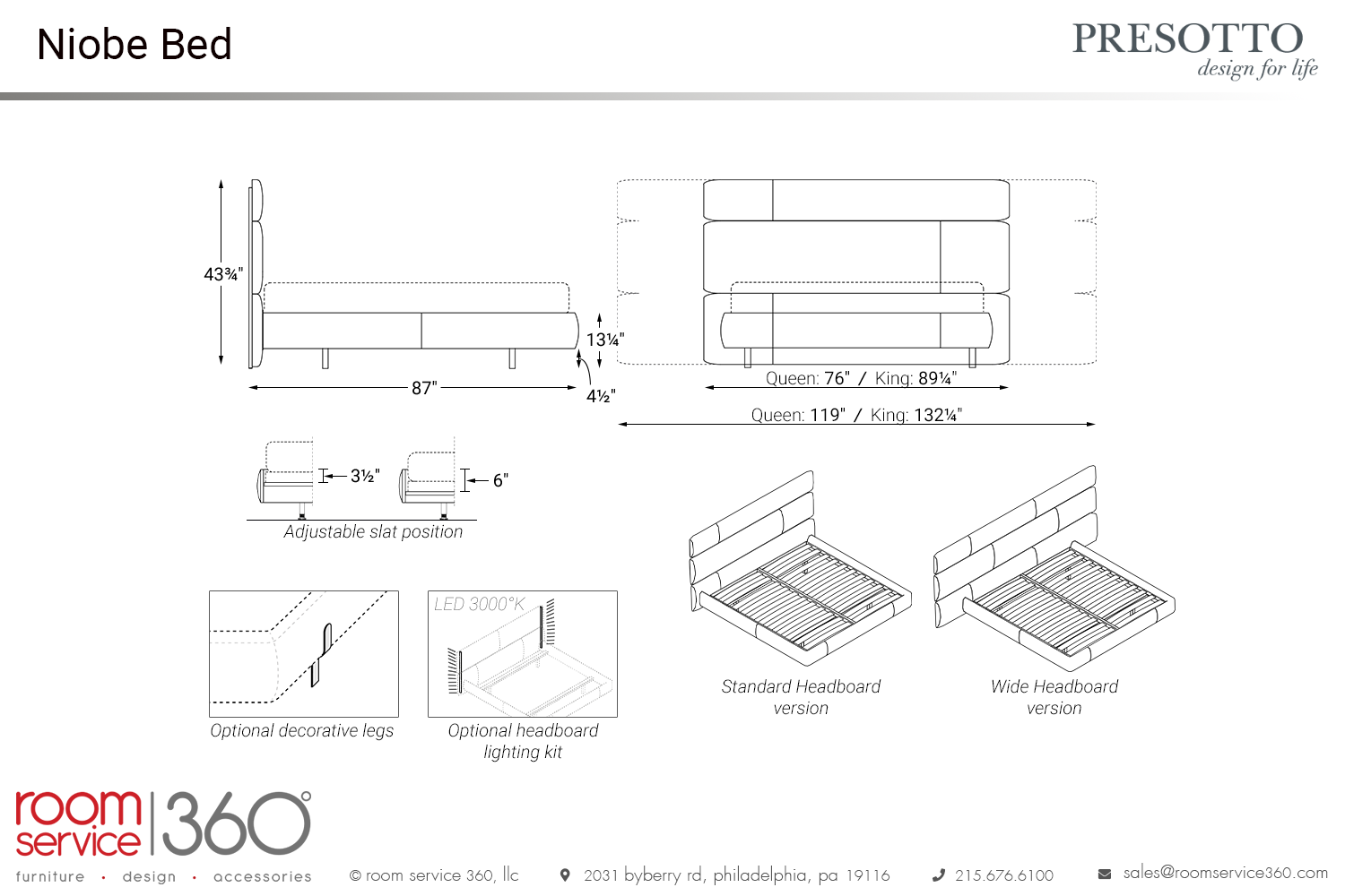 - Standard or wide centered headboard versions