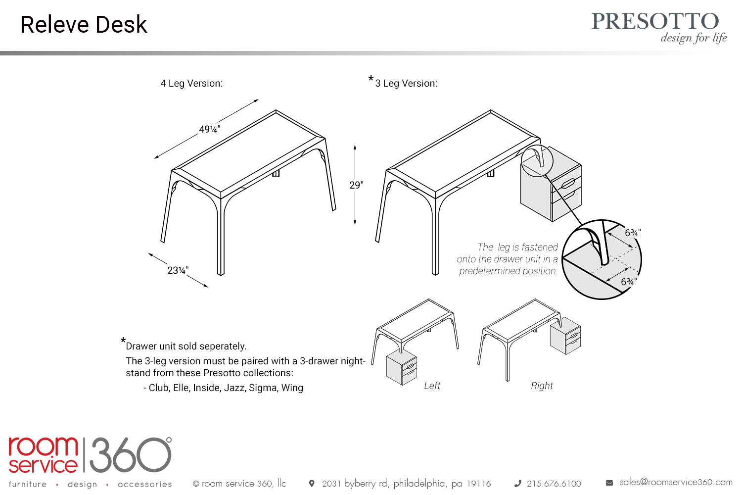 - Compatible with Presotto 3-drawer nightstands from the Club, Elle, Inside, Jazz, Sigma, and Wing collections