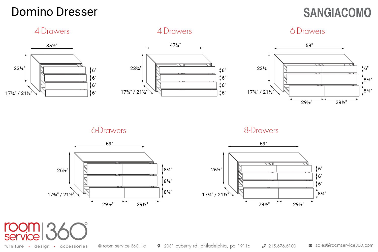 Storing clothes and other belongings is a breeze with the Domino dresser by San Giacomo. The simple design brings a timeless style to the room and adapts well to your existing furniture and decor. Thanks to the spacious drawers, there is ample space to stay organized. Also, the top is large enough for many display opportunities. To form a cohesive finishing look in the room, pair this dresser with other pieces from the Domino collection.