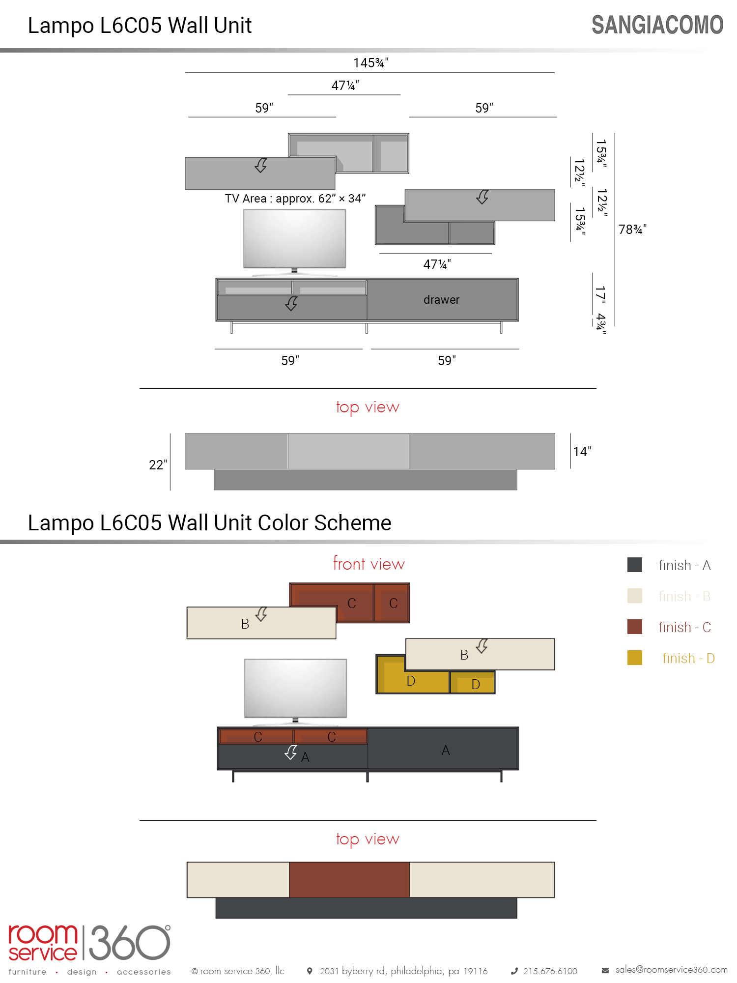 - Finishes B, C, D come in different laminate, lacquer, and wood options