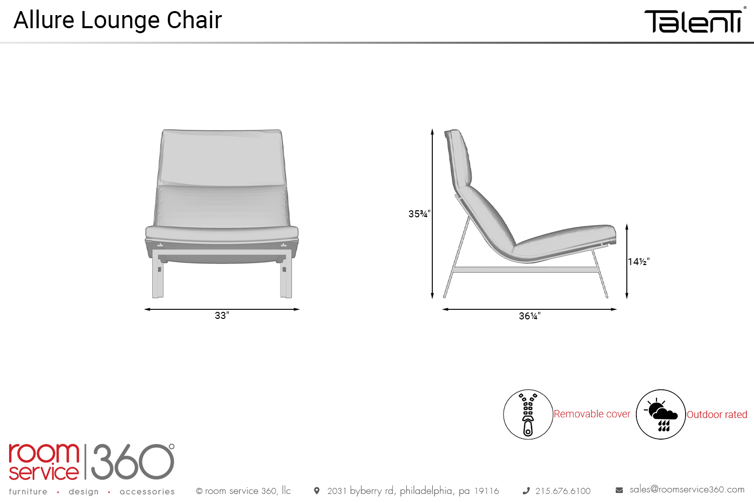 The sense of high style and personality in the Allure lounge chair completes outdoor environments. Featured in the design of this sunshine seating solution is a soft and curved line of cushions forming the seat, a supportive aluminum frame, and upholstery around the frame that brings extra style and depth. Outdoor-rated, it lasts long on your deck or patio, so it is easy to sink into the feeling of the warm sun and fresh breeze. Pair it with the other members of the Allure collection for a cohesive scene.