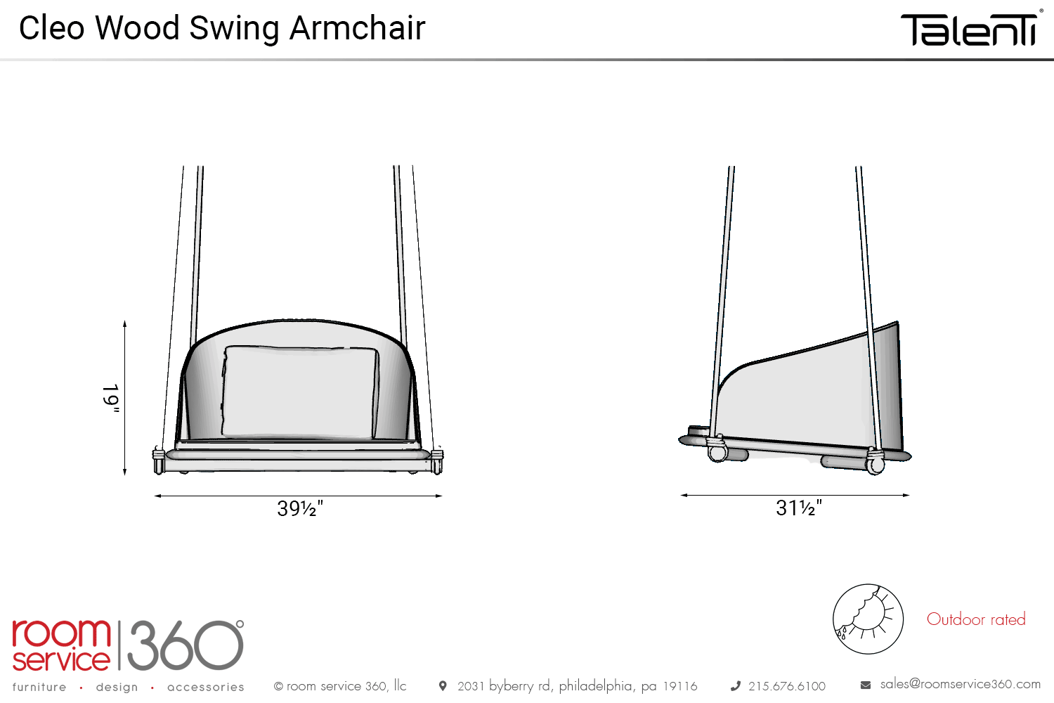 Swing back and forth with the unique and cozy Cleo wood swing armchair by Talenti. The rounded silhouette features sturdy ropes that hold up the seat sturdily on a tree or porch. Thanks to the combination of all outdoor-rated materials, this swing seat stands out in style. The round back features high armrests that offer ergonomic support, and the cushioned lining provides comfort for hours. Pair with other pieces from the Cleo collection to complete the stylish look.