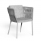The Cliff dining armchair is versatile and doubles as a comfortable outdoor seating solution and sculptural work of art. The back and arms feature a geometric pattern made from rope that brings a nautical style to the space, making these perfect for poolside settings. In addition to being aesthetically pleasing, the rounded design offers comfort and ergonomic support when eating and conversing. The cushioned seat and back and soft upholstery add high comfort levels.