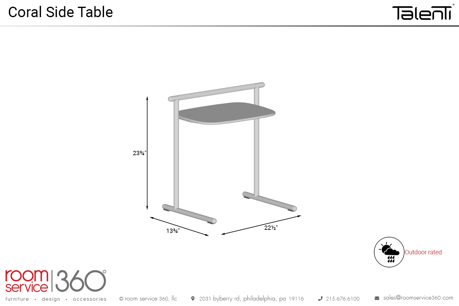 Complete an outdoor space with the Coral side table from Talenti. This beneficial accent piece slips cleanly underneath the furniture to keep a drink nearby. Its meticulous construction concept, particularly the horizontal bar on top, makes it easy to move and handle around your patio, desk, or poolside. The bar is wrapped in rope for an extra touch of style. An aluminum frame and ceramic top are stylish, luxurious finishes that are simultaneously durable and officially protected by harsh UV rays and unpredictable weather.