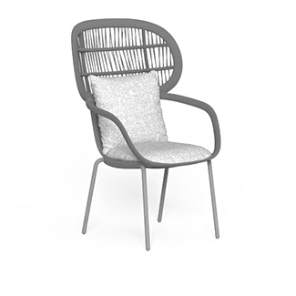 The Panama dining armchair works well with other elements of the Panama collection. You can customize this chair with several aluminum structure colors, and the rope color coincides with it. There is a version with a lower back and a higher back. Some aluminum finishes have extra upholstery options.