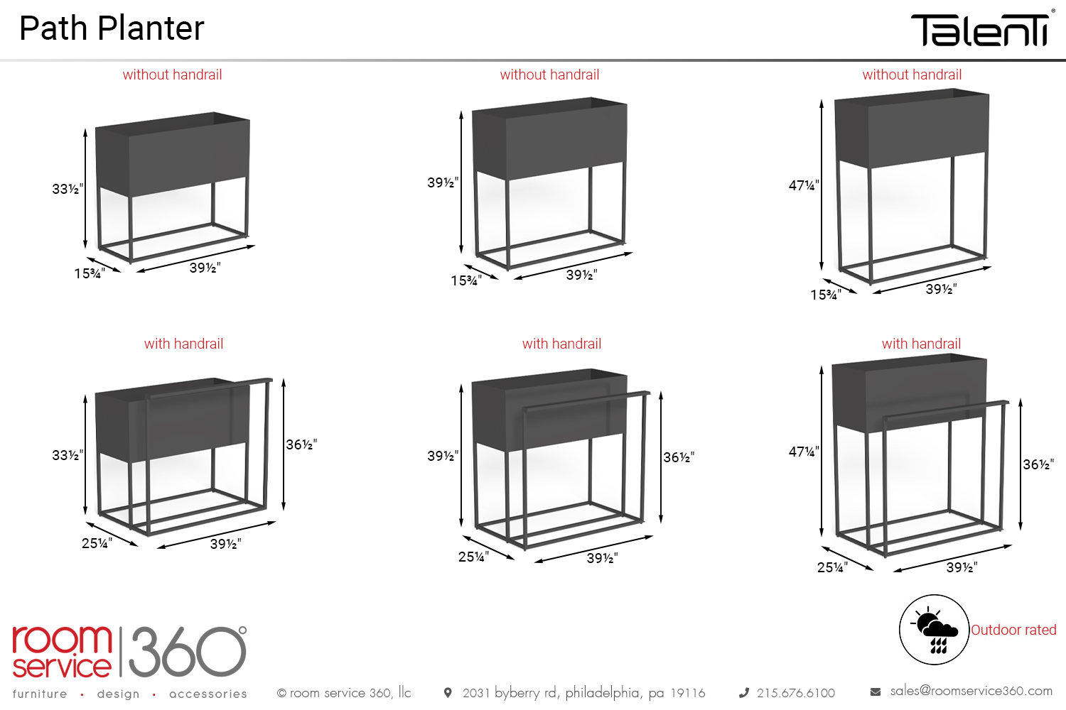 The Path Planter comes in three sizes. With its outdoor-rated materials, it will stand the test of time and the test of the elements with ease. Its stainless-steel structure is available in either white or graphite finishes. It can be purchased with or without the handrail.