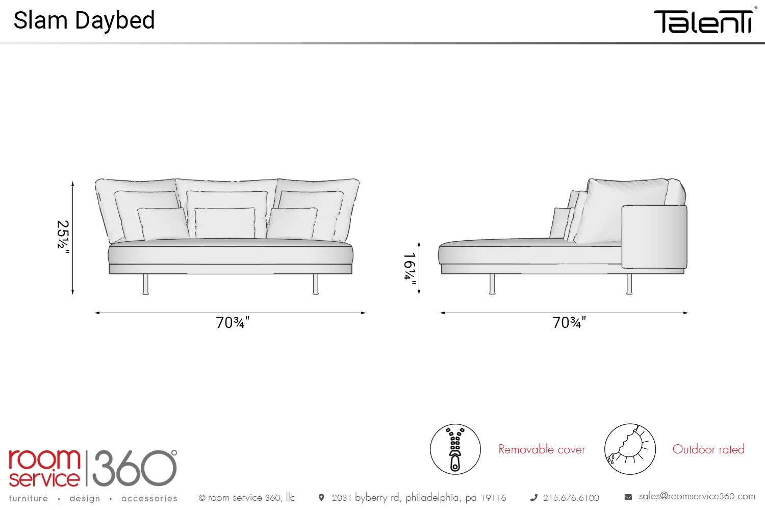 Manufactured with care and designed by Ludovica and Roberto Palomba, the Slam daybed is easily customized. Various upholstery options are available, and the frame comes in aluminum finishes. Decorative pillows sold separately.