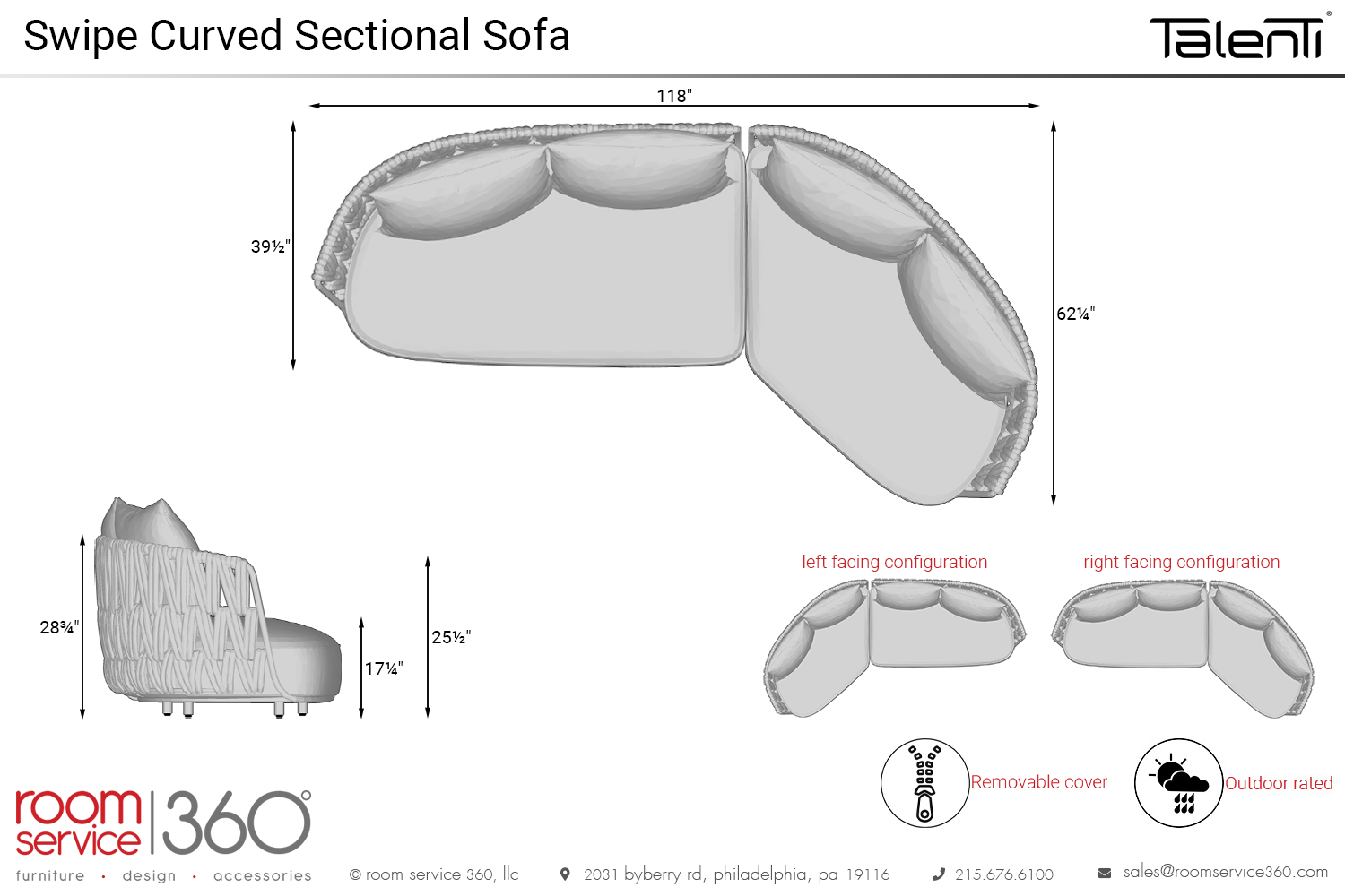 - 118"W × 62¼"D × 28¾"H