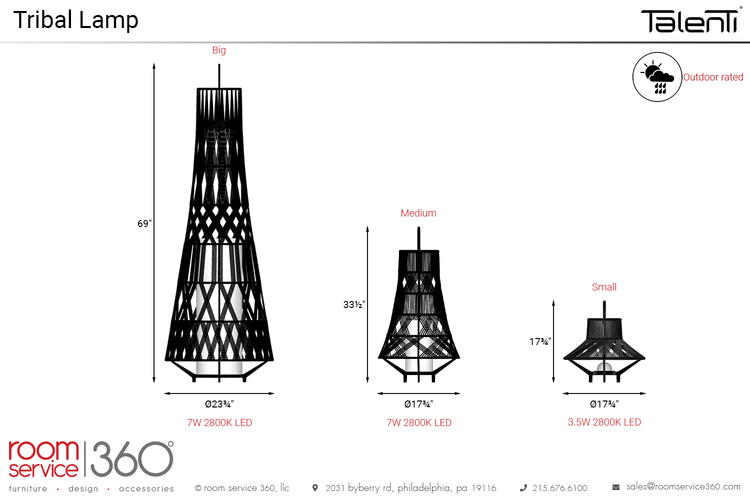 The Tribal lamp truly shines alongside the other pieces of the Tribal collection, including the Tribal Celin outdoor hanging light. It is available in three sizes and comes in five colors: dove, graphite, yellow, teal green, and red, matching any décor and any color scheme. The 3.5W (for the smallest size)/7W (for the medium and largest size) LED light has a rechargeable battery.
