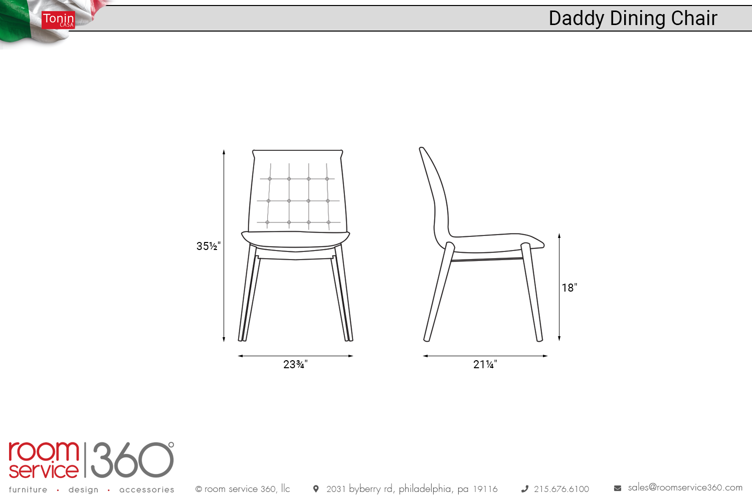 Customize this chair to perfect specifications by choosing from a wide array of fabric, leather, and eco-leather upholstery options in various colors and textures. Three lustrous metal options in carbon grey, stone bronze, and matte gold can be selected for the legs. The Daddy dining chair is manufactured in Italy by Tonin Casa with incredible attention to detail.