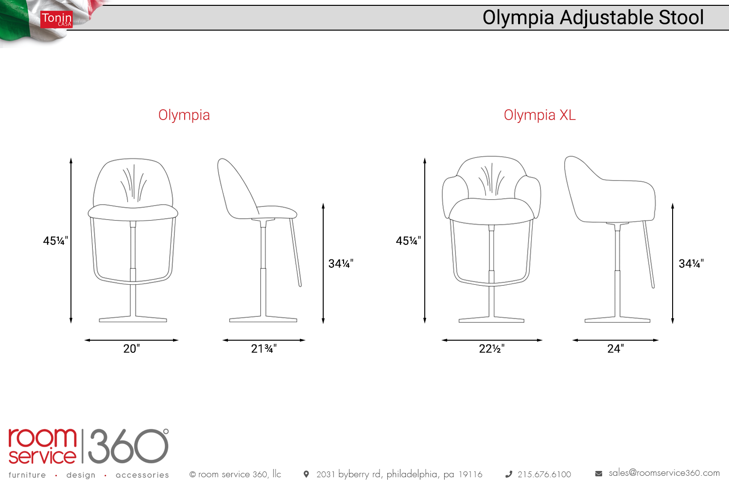 A version of this stool with arms is available for extra support. Customize the look and feel from various fabrics, leathers, and eco-leathers in many colors and textures. The base is matte black painted metal. The Olympia adjustable stool is manufactured in Italy as part of the Olympia collection of seats from Tonin Casa.